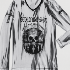 Kingz tasarımı bu uzun kollu t-shirt, beyaz zemin üzerine işlenen sis efektli görünümü ve dikkat çekici kuru kafa baskısıyla öne çıkar. Kadınlar için özel üretilmiş bu model, gotik dokunuşları modern sokak modasıyla buluşturur.